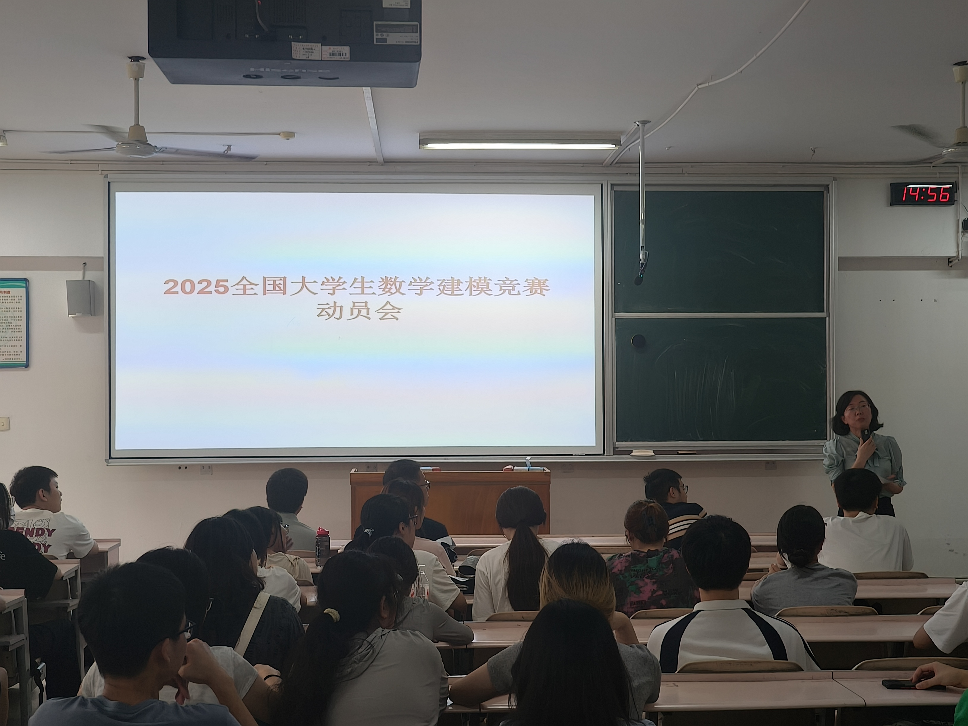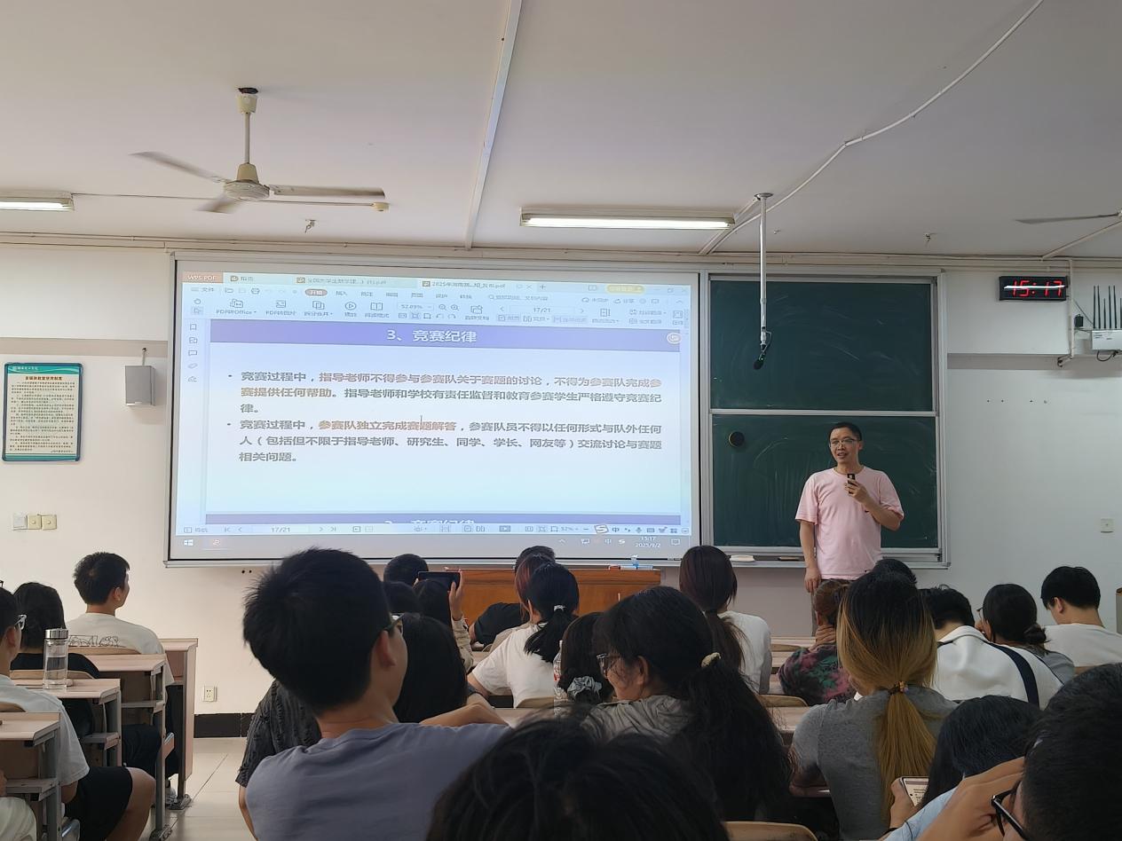 会议最后,何帆老师结合竞赛最新要求,详细解读竞赛流程与具体规则。他系统介绍了2025年竞赛的规则细则与流程节点,着重强调竞赛公平公正原则。何帆老师明确说明:“竞赛将启用严格查重机制,对学术不端行为实行‘一票否决制’,一经发现抄袭情况,立即取消参赛资格。”此外,针对AI工具辅助参赛的情况,何帆老师特别要求:“凡通过AI生成的程序或算法,必须清晰标注来源信息,严防内容重复问题。”