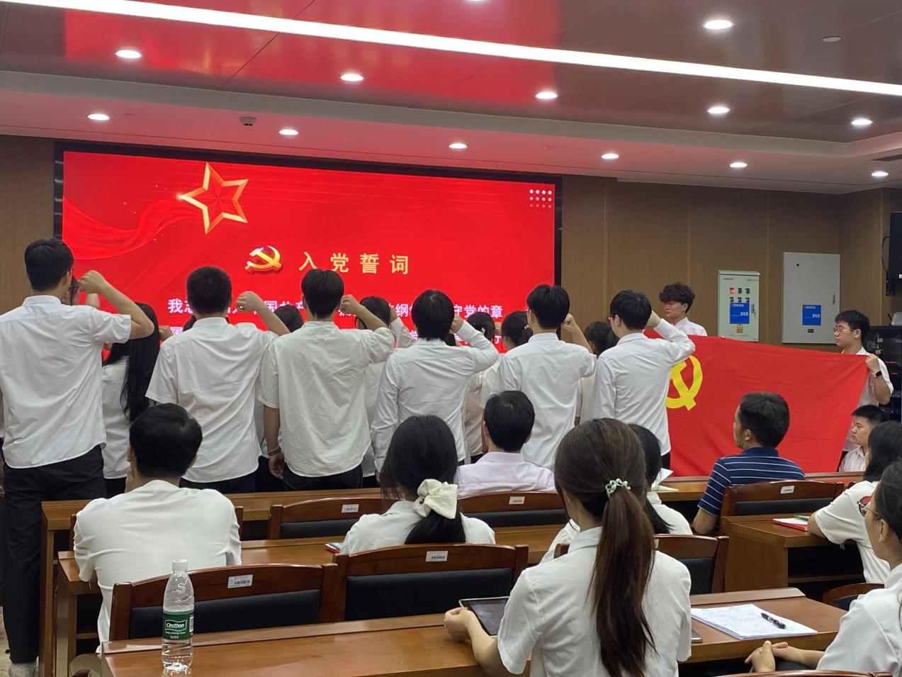 会议第二阶段——毕业生党员重温入党誓词。全体毕业生党员肃立于党旗前,高举右拳,郑重宣誓。每一句坚定的誓言,都重新点燃了毕业生党员们入党的初心之火,坚定了他们为共产主义事业奋斗终身的坚定意志。