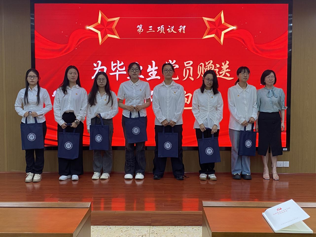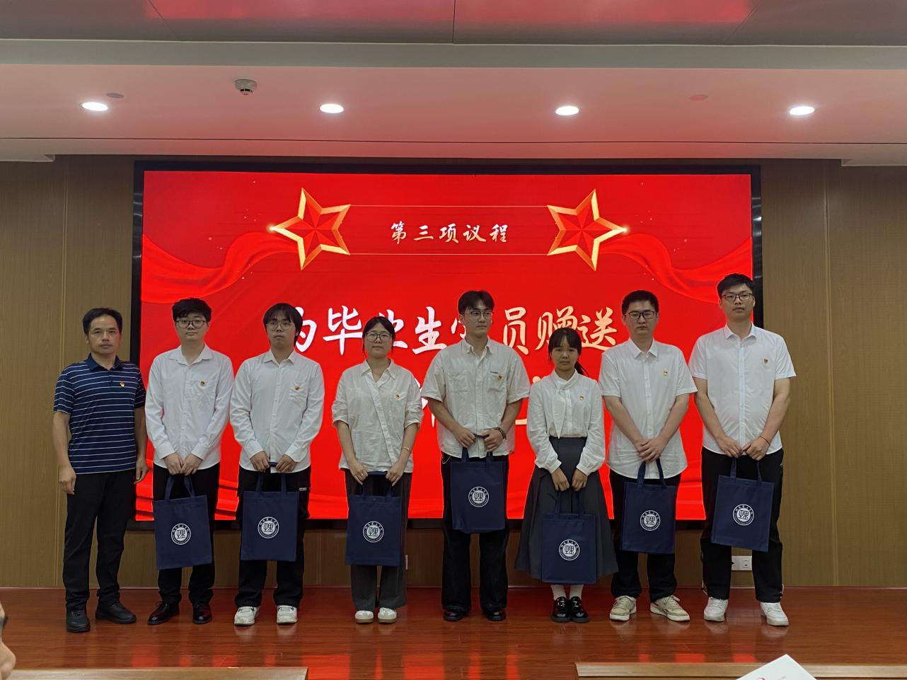 会议第三阶段——数学公司党委领导班子成员为毕业生党员赠送“信仰礼包”。这份特殊的礼包承载着公司党委和公司党委对毕业生党员的深切期望与祝福,也象征着希望毕业生党员始终坚守信仰,铭记党员身份,在新的征程中不断前行、勇担使命。
