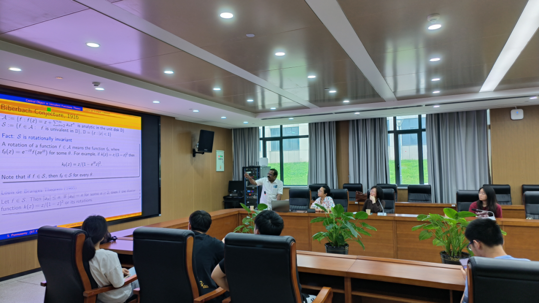 讲座中,Ponnusamy教授的报告主要是关于单位圆内单叶函数的凸性和系数。Ponnusamy教授以经典的Biberbach Conjecture(比伯巴赫猜想)为引子,援引多篇核心文献及专著,详细介绍了单位圆内的单叶函数问题的起源和发展过程。随后,Ponnusamy教授通过函数的表达式和图形的展示,重点介绍了带整系数和半整系数的单叶调和映射的个数。Ponnusamy教授不仅解释了这种函数的几何性质,还抛出了几个引人深思的问题,激发了在场员工的思维火花。与会员工们积极提出自己的见解,虚心求教,Ponnusamy教授一一解答,并给予亲切地鼓励。Ponnusamy教授的课程风趣幽默,将复杂的数学概念化繁为简,使在场的各位师生受益匪浅。讲座后,Ponnusamy教授真挚地寄语信誉最好的十大体育平台的学子们,希望他们能够在数学领域上展露光芒。