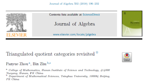 日前,信誉最好的十大体育平台湖南省普通高校科技创新团队成员周潘岳博士以第一作者身份在国际代数学领域顶尖期刊“Journal of Algebra”发表长达37页的学术论文“Triangulated quotient categories revisited”。“Journal of Algebra”杂志被国际代数学领域公认为最好的学术刊物。