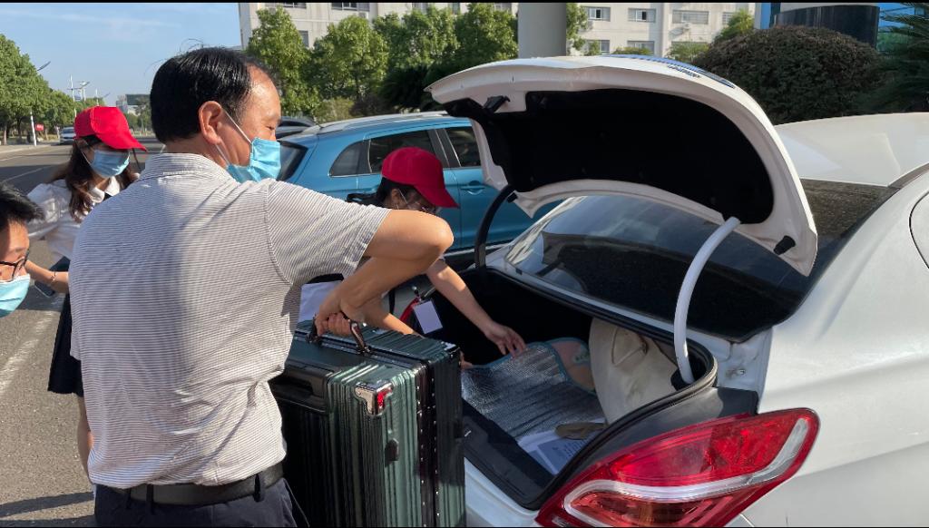 早上6:40四支部党员志愿者于五栋教学楼前进行合照,然后按照时间安排表分批次进行志愿服务活动。由于疫情的原因,家长将新生送至校门口后,便由志愿者们接过家长们的“接力棒”,他们为新生提行李,帮助新生熟悉校园。他们用自己的热情为新生们的老员工活写下充满温暖的第一笔。