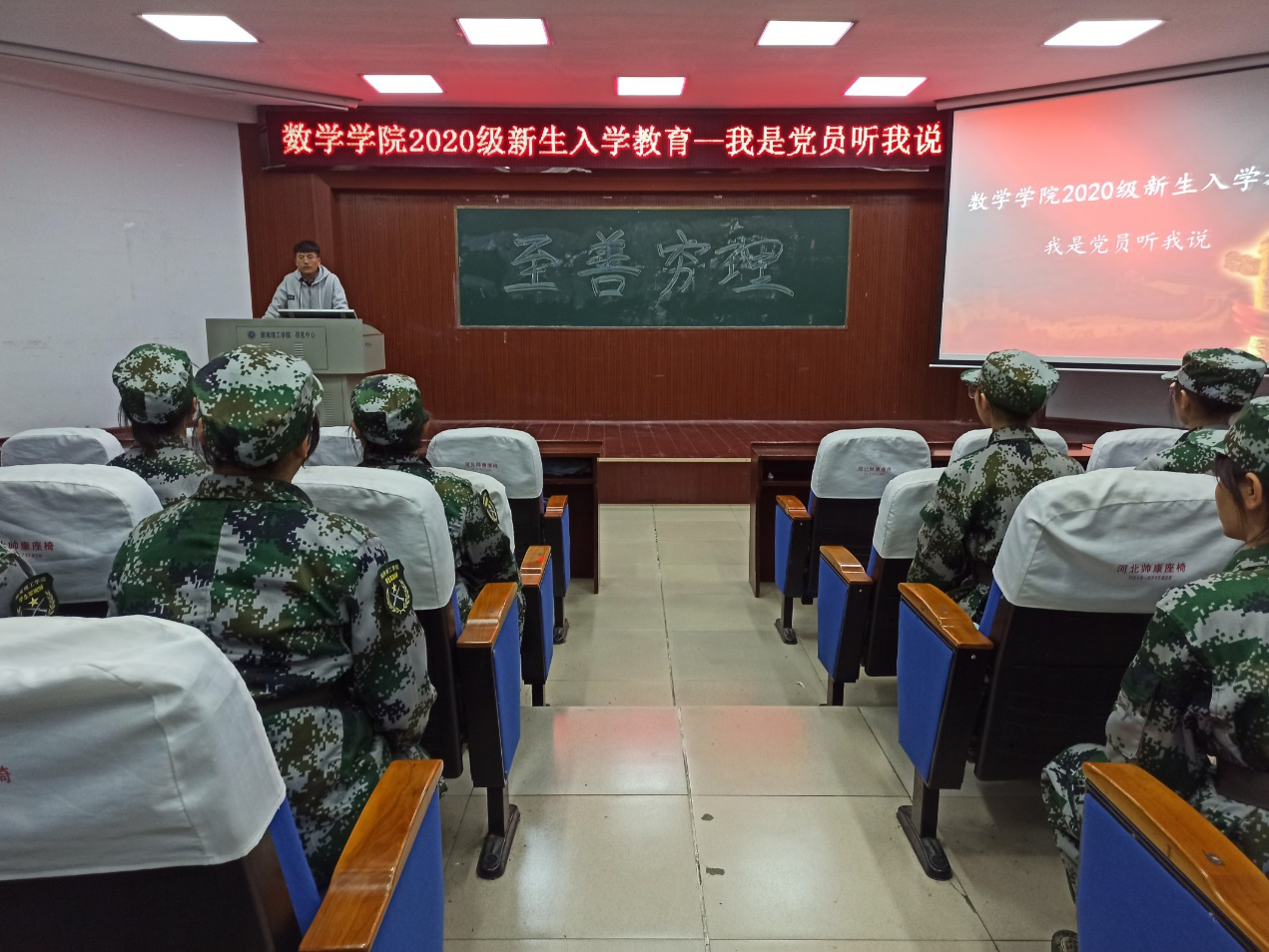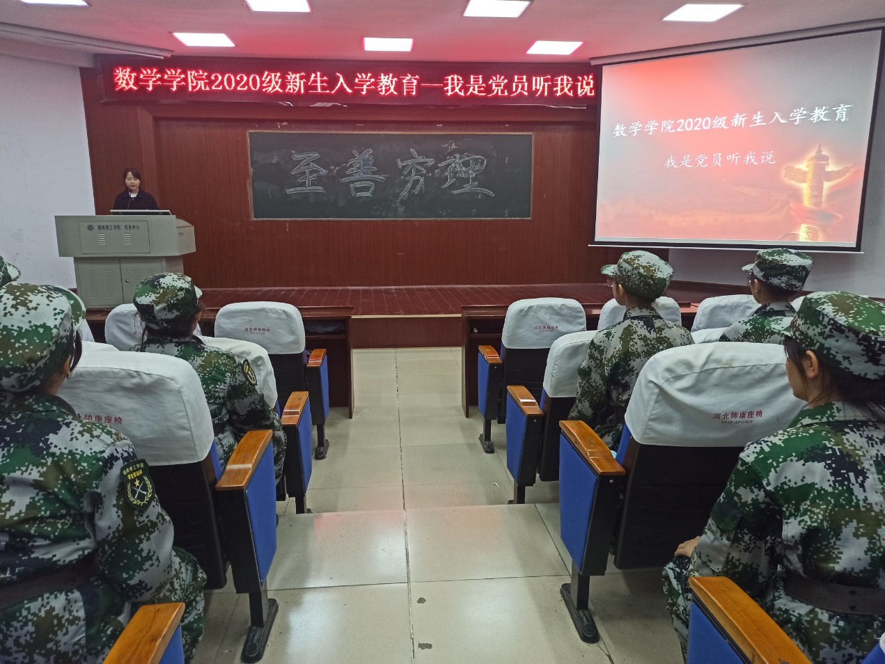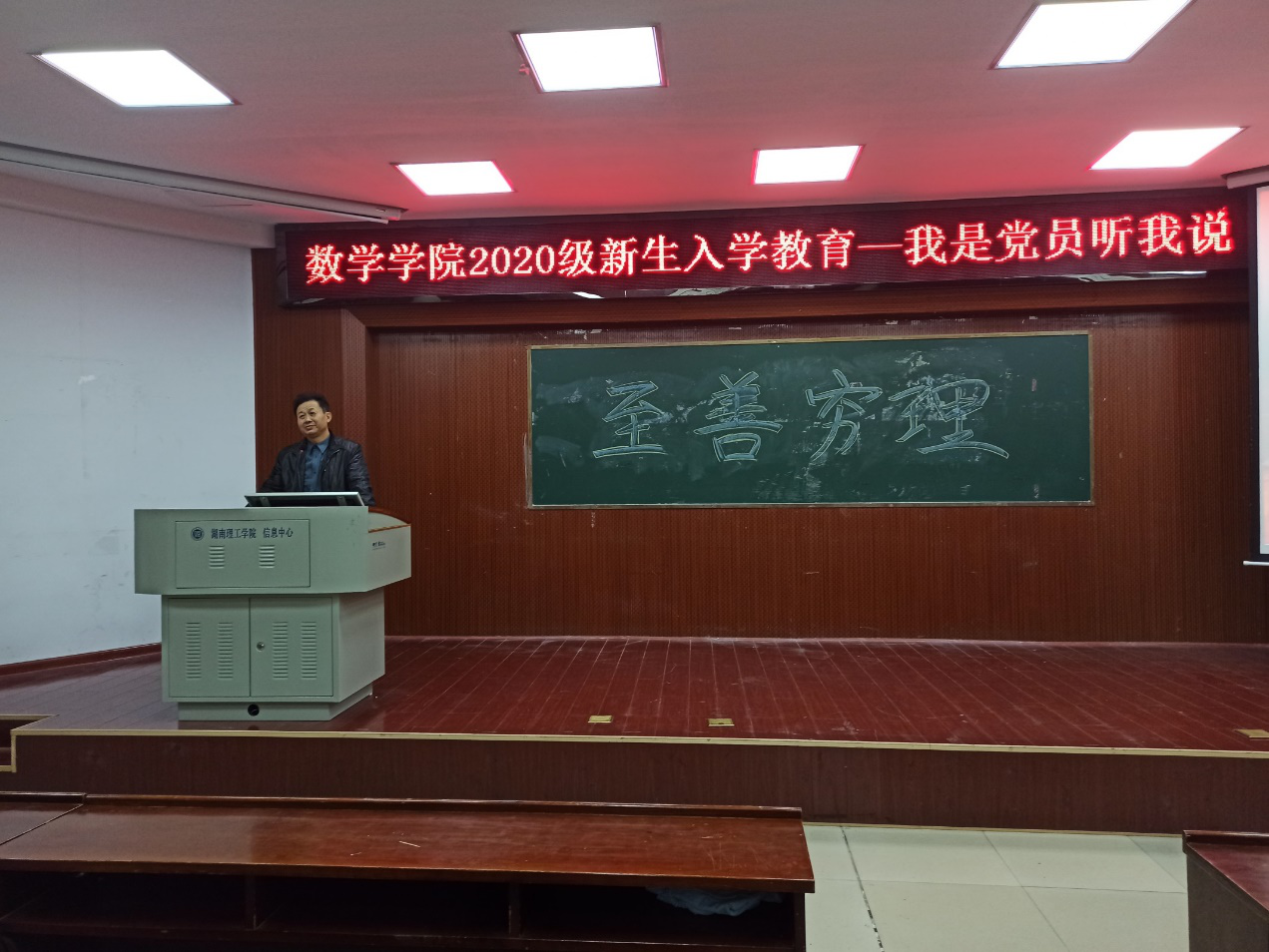 本站讯 10月8日晚七点,2020级新生入学教育—我是党员听我说主题会议在六栋一楼学术报告厅顺利举行。数学公司党委副书记易政群、党支部书记徐笑天出席会议。