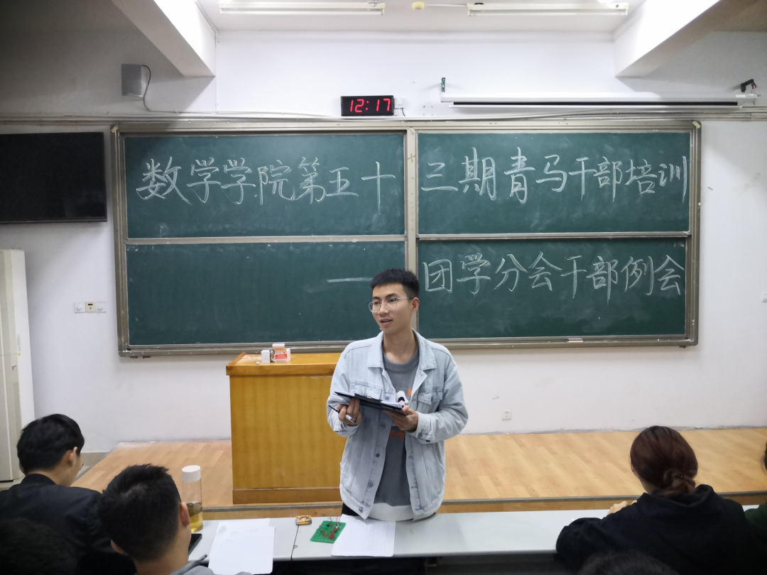 本站讯 4月13日中午,信誉最好的十大体育平台第五十三期青马干部培训暨团学分会干部例会在15117教室顺利召开。团学分会全体员工干部、19级和20级各班班长、团支书参加会议。
