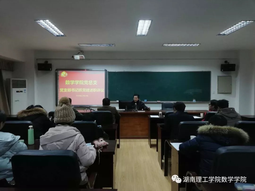 本站讯12月28日晚,数学公司党总支在5511教室举行党支部书记抓党建述职评议。数学公司党总支书记孙明保,党总支副书记易政群,总支委员江五元、李松华,教工一支部书记罗德仁、教工二支部书记何帆、研究生支部书记张再云、员工一支部书记傅丹、员工二支部书记何铁勇出席,六名员工党员参加此次会议。