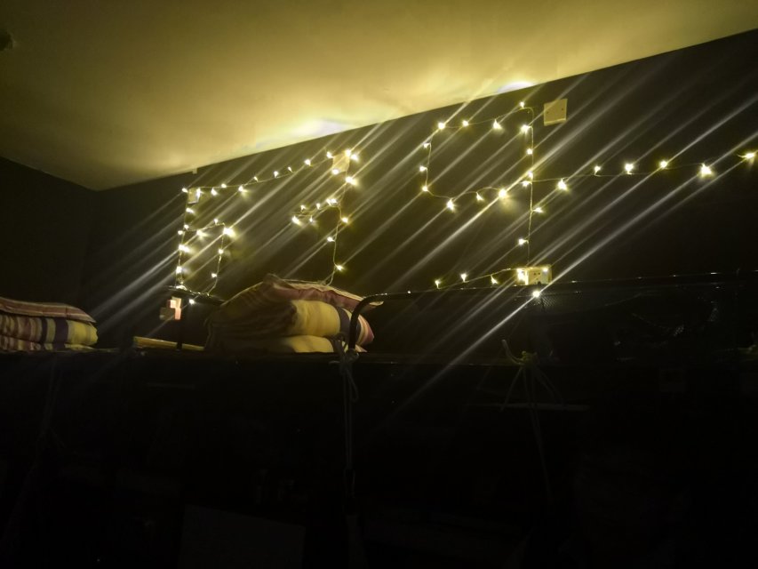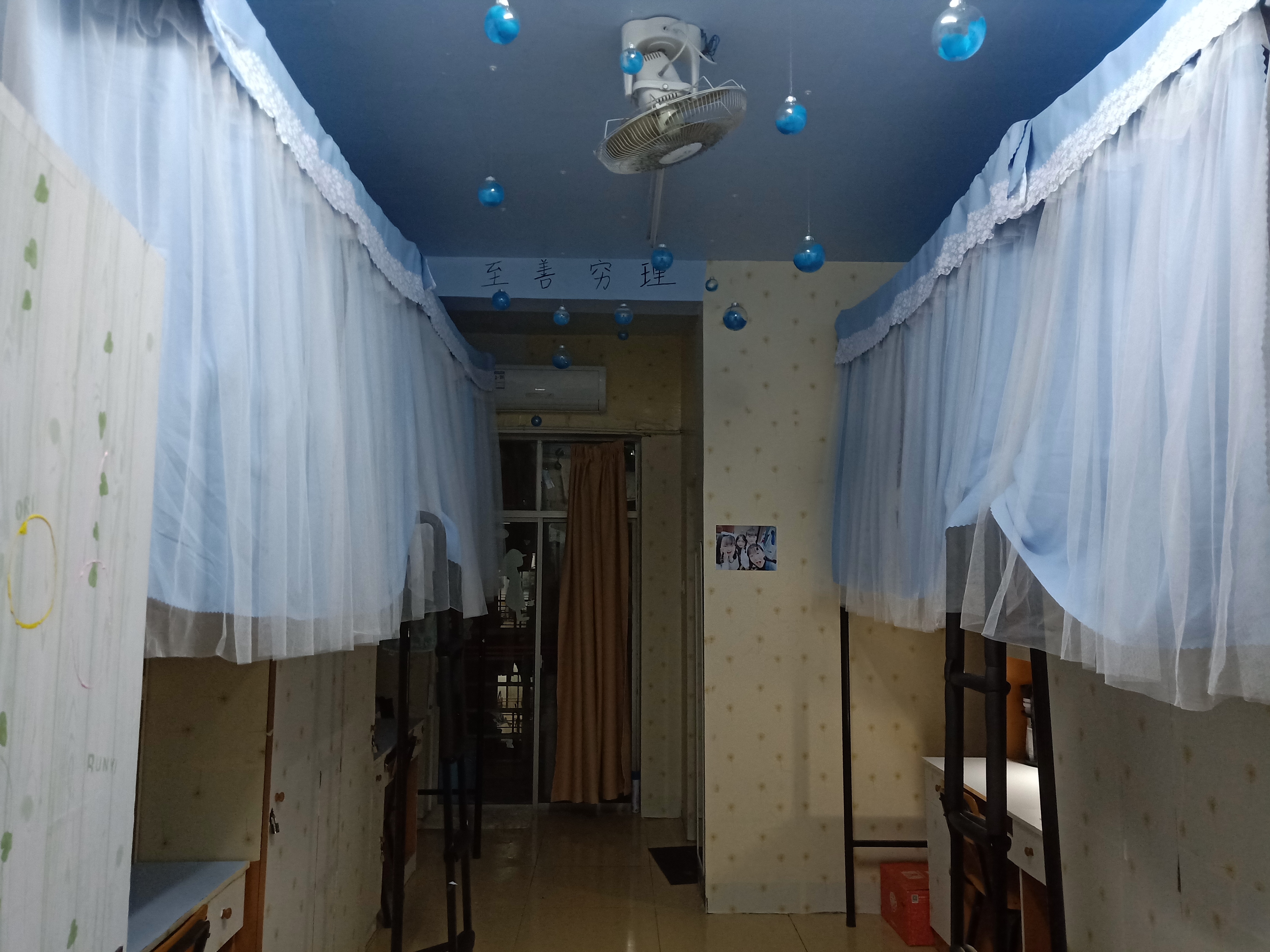 这个天花板上的蓝色吊坠真的太美啦,和梦幻一般的床帘搭配,挺不错的~