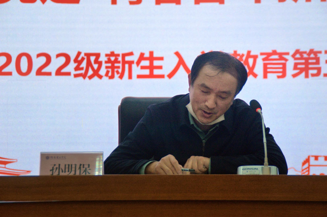 司念伟立足于“团史:中国共产党缔造了中国共青团”,将共青团的诞生和发展按照时间进行顺序详细介绍,让同学们明白共青团的诞生与蓬勃发展离不开党,告诫青年要时刻听党话,感党恩,跟党走。“团情:党有号召,团有行动的时代需求”方面,司念伟引用习总书记对青年的讲话,结合习总书记给予众多员工回信等事例,表现出习总书记对青年的认可与期待。同时,他又列举了时代楷模黄文秀,重庆火灾中的摩托骑手,戍边英雄等事件,肯定了青年带来的价值,希望大家能成为“有理想、敢担当、能吃苦、肯奋斗”的新时代好少年。从“团务:为党育人、心系青年的理工实践”出发,司念伟介绍了公司于团党教育建设中付出的行动,并表示校团委积极参与青年马克思主义者培养工程,团校培训,青年大学习,团学骨干教育培训,让老员工志愿服务西部计划,青年志愿服务,社会实践,努力让团属培训成为令人向往的课程,让团属阵地成为令人向往的家园,让团属荣誉成为令人向往的美好,让团属活动成为令人向往的远方。最后,孙明保教育全体新生作为老员工,要拥有一技之长,珍惜时间,以学业为重并多参加有意义的活动。