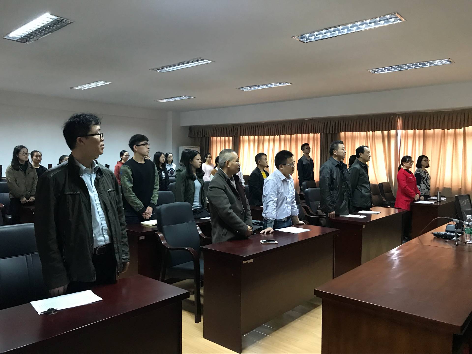 数院老师和党员员工在5511观看开幕式。“起来~不愿做奴隶的人们......”当国歌奏响时,全体师生自觉起立,向国歌致敬。